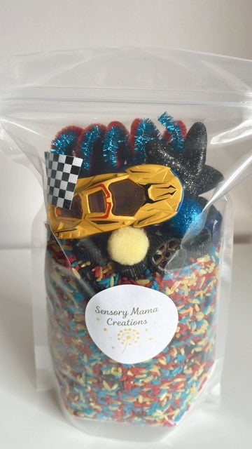 Each bag comes with 3 cups of dyed rice, a wooden scoop and themed loose parts.